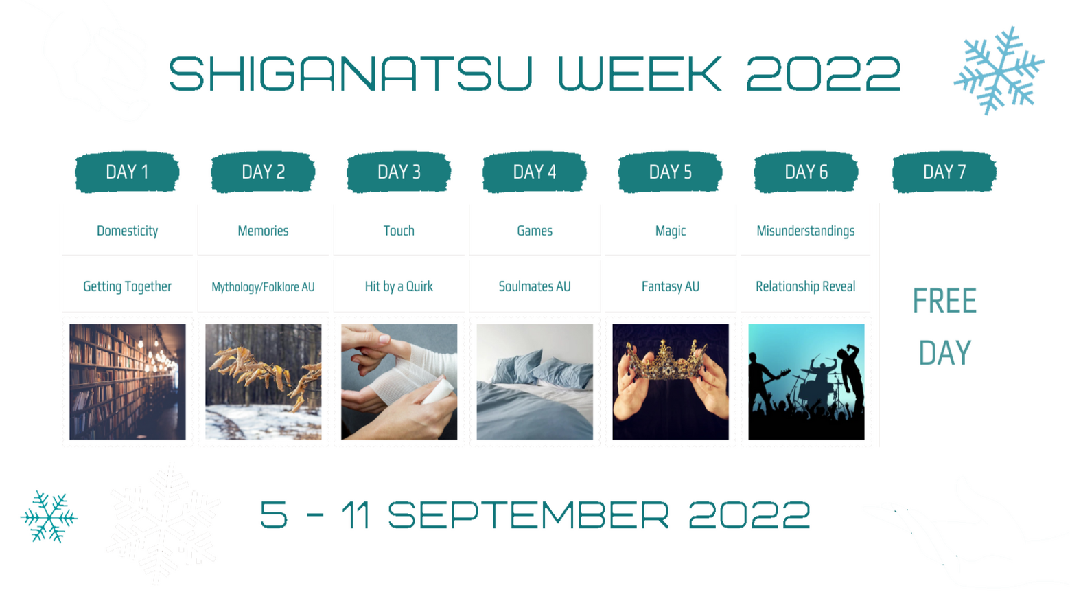 Prompts: 3 prompts will be provided per day: 1 word prompt, 1 trope/AU prompt and 1 image prompt. Specific prompts will be released closer to the event!Posting: Please tag us @shiganatsuweek in your posts so we can share them! Also, feel free to add your works to our AO3 collection (linked below)Other Ships: Other ships are allowed as long as ShigaNatsu remains the main focus!Content Restrictions: There are no content restrictions for this event, but we do ask that NSFW entries have appropriate tags/CWs where possible